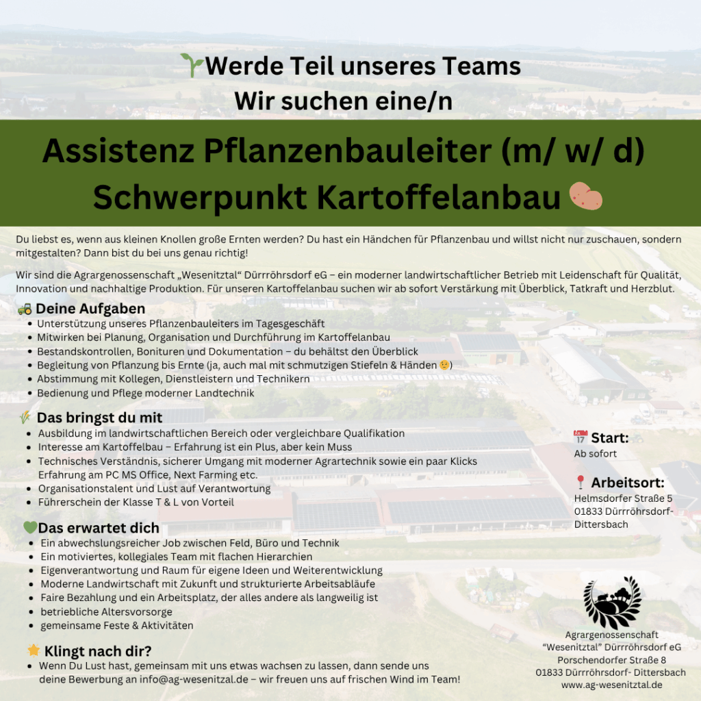 Haben wir Dein Interesse geweckt? Dann freuen wir uns, dich bald kennen zu lernen. Bitte sende deine Bewerbung an: info@ag-wesenitztal.de oder an unsere Postanschrift: